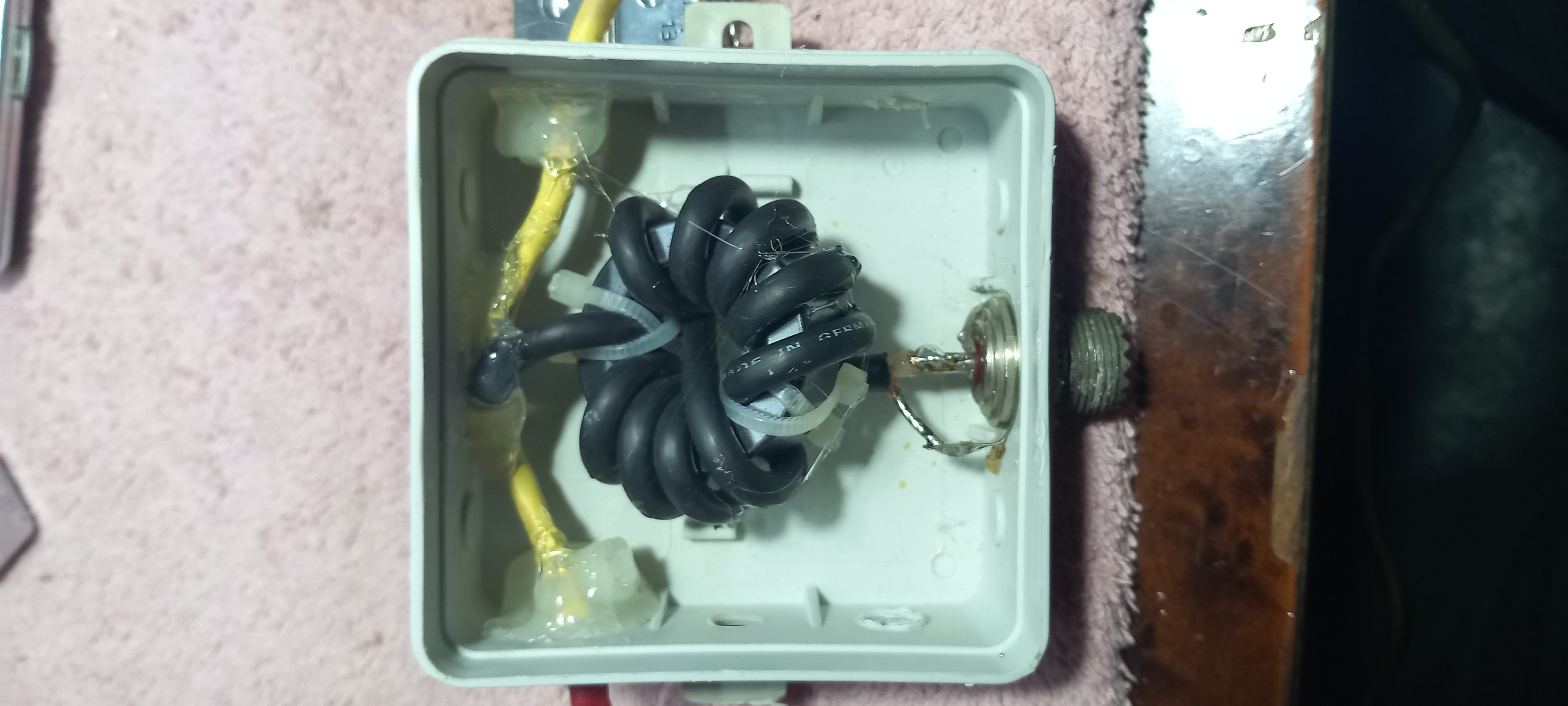 Hier habe ich den Strom Balun mit der Antenne verbunden und sie in das Kunststoff Gehäuse eingebaut.