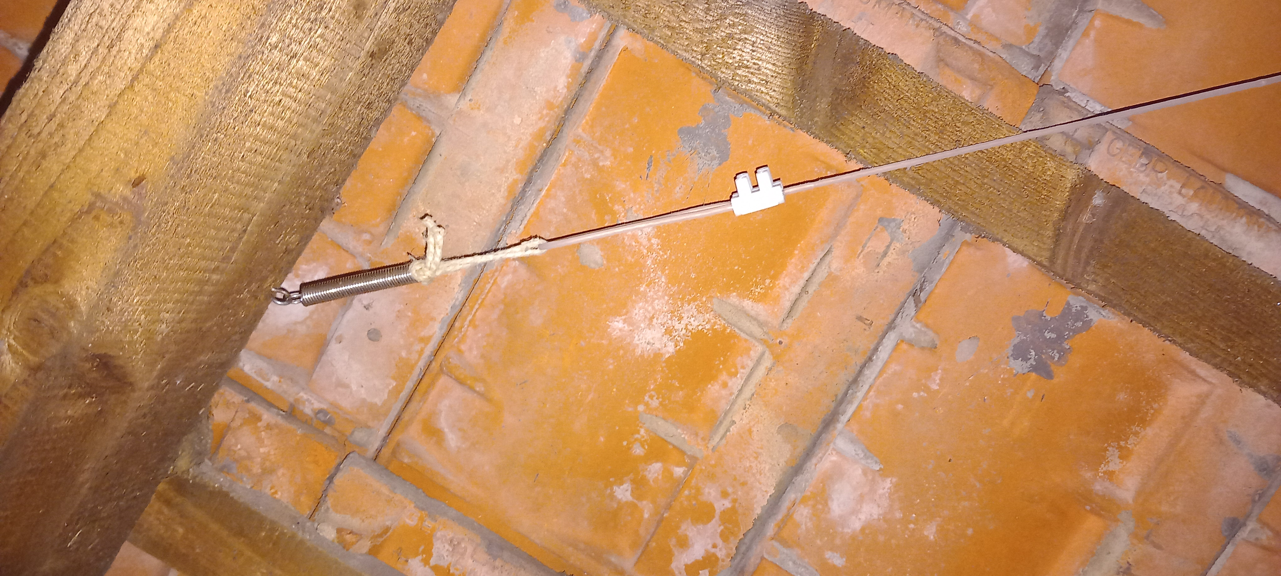 Rechts und Links montierte ich einen hacken in dem Balken und setzte da eine Feder auf, an der Feder machte ich eine Schlaufe aus einer Kordel und daran machte ich die Antenne mit der Lüsterklemme. So kann ich mit Hilfe der Klemme die Antenne verschieben und die Stehwelle einstellen.