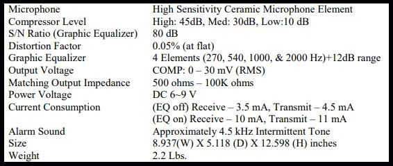 Eingebautem VU-Meter und Tonregulierung Impendanz 0-5 K Ohm . Frequenz 250-3500 Hz. Regelbar -23dB . Electret Kapsel Stromversorgung: 9 Volt Abmessungen: 95 x 160 x 230 mm Gewicht: 1,1 kg.