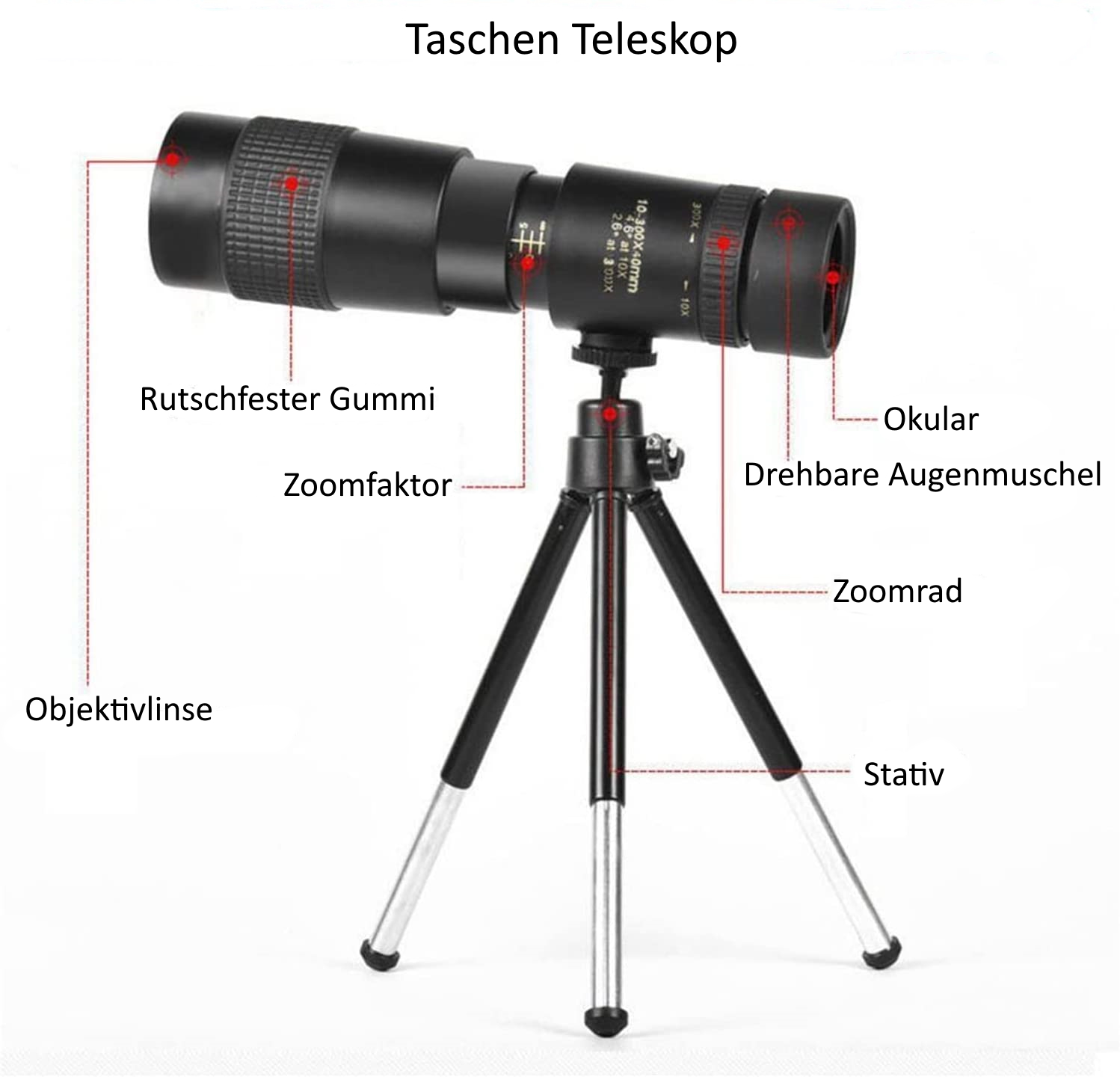Ein einfaches Taschen Teleskop, klein und leicht man merkt es kaum in der Tasche oder am Gürtel. Ein kleines Stativ ist dabei und ein Anschluss für Smartphones, um direkt Bilder zu machen. Es ist prima nutzbar bei Spaziergänge, auf Berge mit freier Sicht, genauso wie im Wald. Also genau das richtige für kleine Beobachtungen.